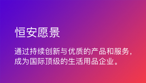 恒安堅持“誠信、拼搏、創(chuàng)新、奉獻”的精神,以“追求健康,你我一起成長”為使命,通過持續(xù)的創(chuàng)新與優(yōu)質(zhì)產(chǎn)品服務,致力成為國際頂級的生活用品企業(yè)。